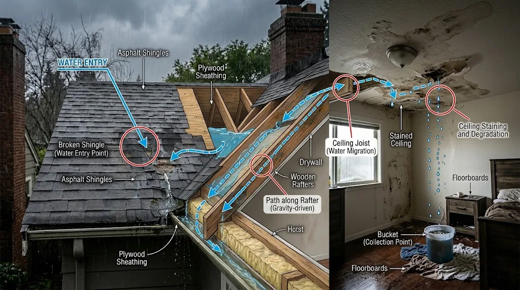 That ceiling stain in your living room might actually be caused by a damaged shingle several feet away and a few feet higher up the slope. Gravity does the work, and water follows whatever path is available to it — along joists, down rafters, through insulation — until it finally pools somewhere visible.