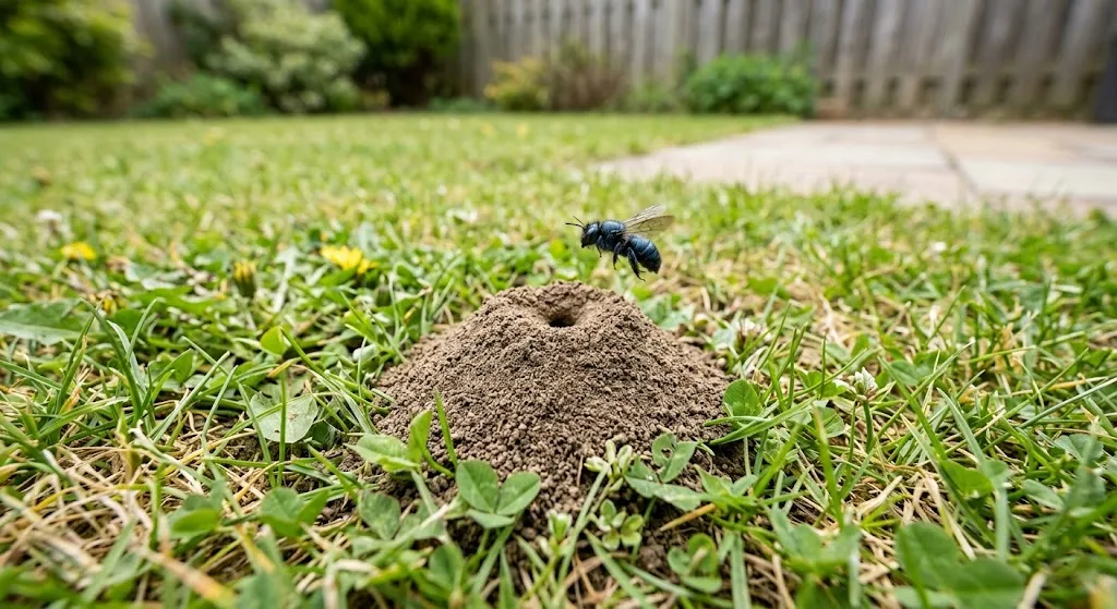 Small mounds of soil near entrance holes are another telltale sign of ground bee activity. Multiple bees hovering or entering and exiting holes in the ground is also a strong confirmation.