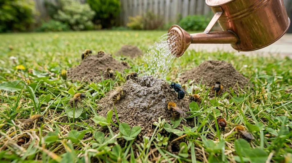 A dish soap and water mix is a gentler chemical option. The soap helps break down the bees’ waxy coating, making it uncomfortable for them to stay in their nests. Mix a few tablespoons of dish soap into a bucket of warm water and pour it slowly into the burrow entrance at night.