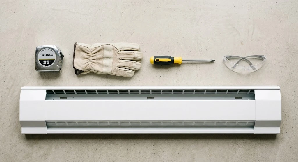 A tape measure is non-negotiable — you’ll need accurate dimensions to buy the right replacement cover. You’ll also want a pair of heavy work gloves and safety glasses. Metal baseboard heater edges can be surprisingly sharp and cause serious injury, so wearing gloves and safety glasses is strongly recommended.