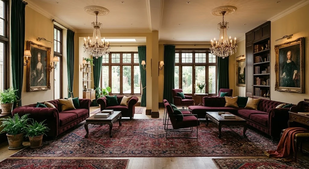 Where modern spaces strip things back, traditional rooms layer things in. You’ll find rich, dark wood furniture with curved legs and ornate detailing. Fabrics are luxurious — velvet, silk, brocade, and leather appear on sofas, chairs, and draperies. Color palettes run warm and deep: burgundy, forest green, navy, gold, and rich brown are all at home here.