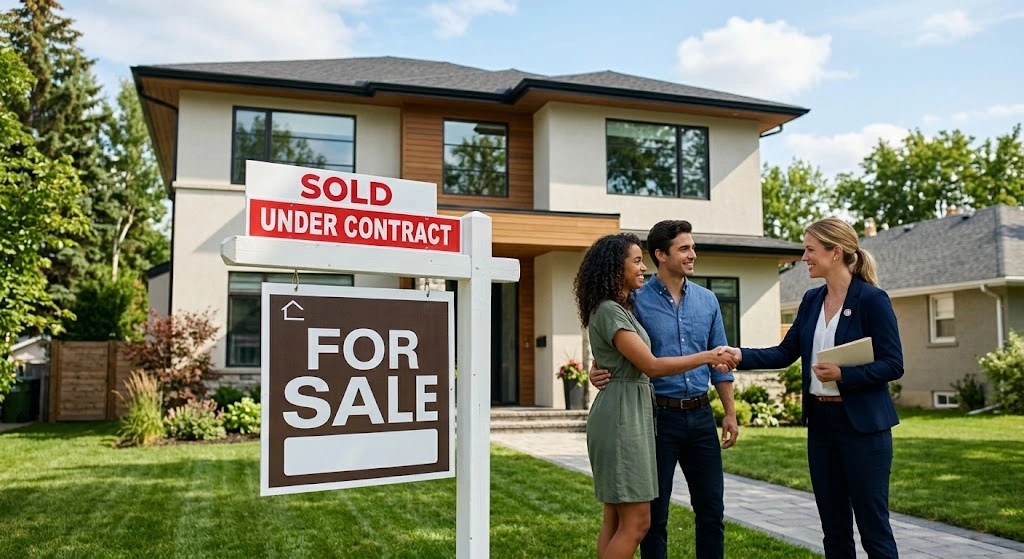A home marked “Under Contract” shows that an offer has been accepted, but the sale is still waiting to be finalized.